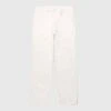 Main material is 100% organic cotton. Rigid denim. Five-pocket construction. Adjustable belt. Button fly. Belt loops. Leather logo patch at the back waist. Unisex.