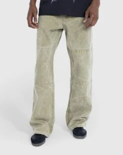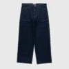 Shell is 100% organic cotton. Pocket lining is 65% polyester and 35% cotton. Pigment-dyed. Button fastening. Zip fly. Belt loops. Slanted front pockets. Back patch pockets. Coin pocket. Leather face logo patch at the back waist. Unisex.