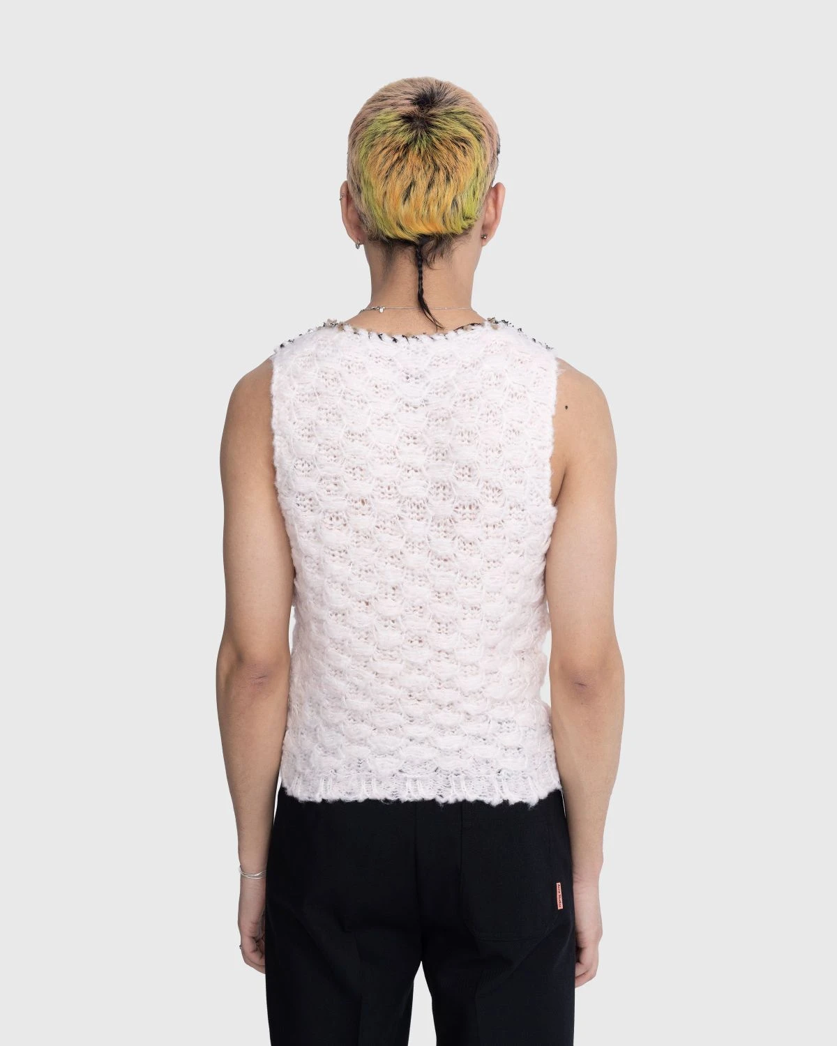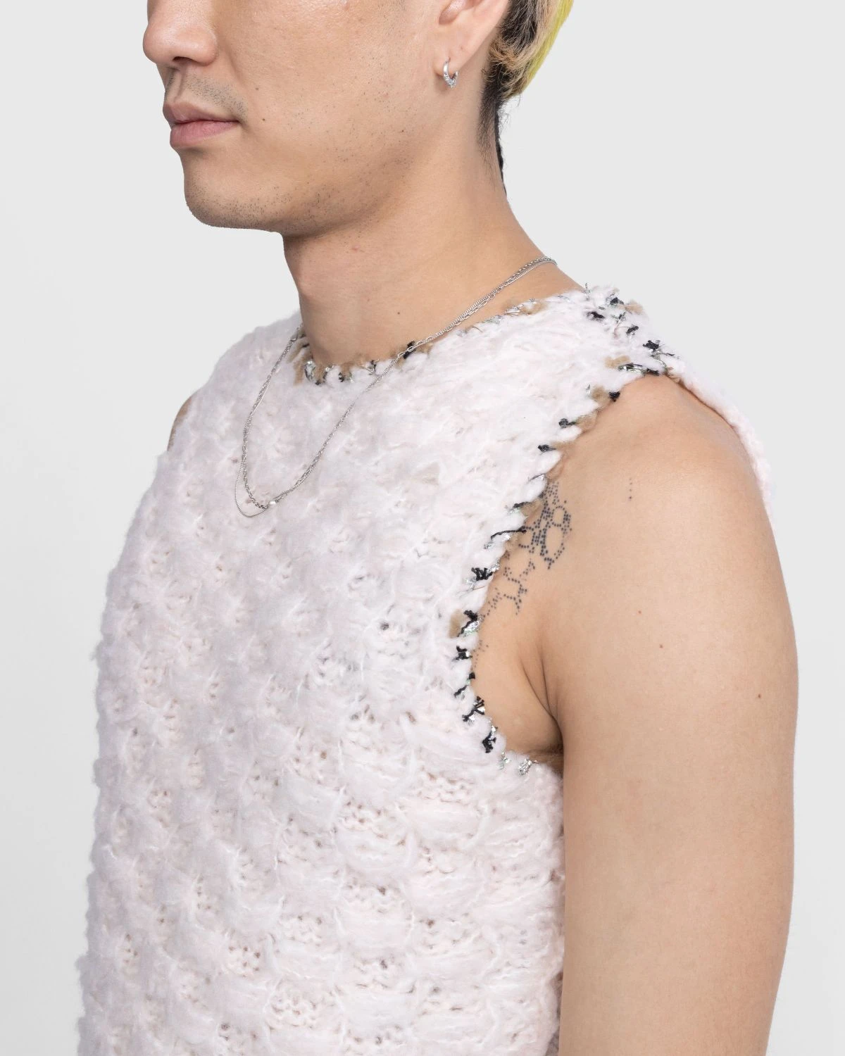 Acne Studiosβ penchant for quality fabrics is on full display with this graceful knit vest. Crafted from a wool blend with an inviting pink hue, the timeless vest arrives with a classic round neckline with metallic details that weave through the seams.