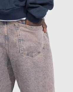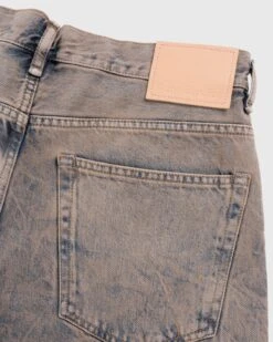Shell is 100% cotton. Rigid indigo denim. Five-pocket construction. Button fly. Belt loops. Dropped crotch. Leather logo patch at the back waist. Unisex.