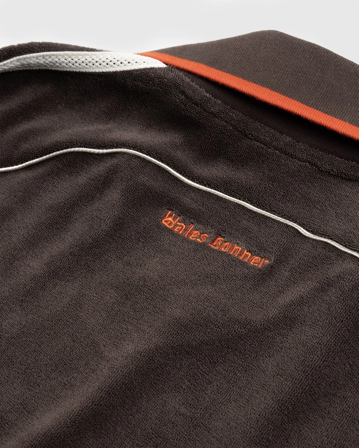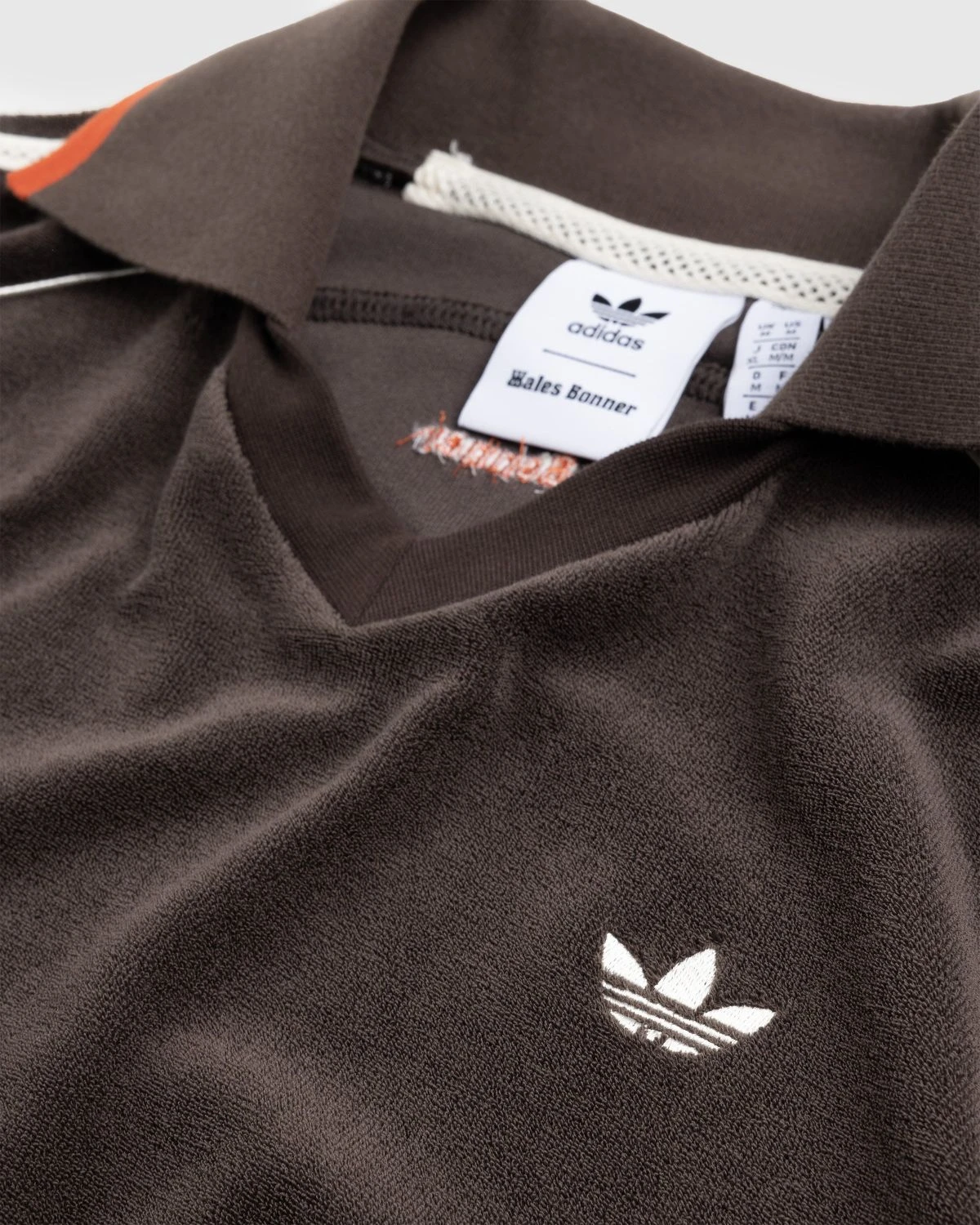 76% cotton. 22% polyester. 2% elastane. Fleece texture. Spread collar. V neck. Three Stripes detail. Trefoil logo at the left chest. Wales Bonner logo at the back neck.