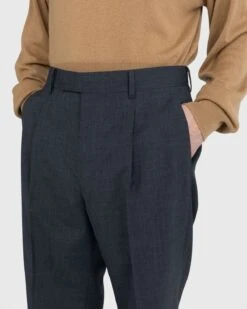These Auralee slacks are produced in a tropical weight wool made of ultra-fine fiber-combed fabric, with a wrinkle-resistant, washable finish and natural stretch for a lightweight fit. The pair features a single pleat front, concealed closure, and belt loops at the waist, in addition to side slip pockets and rear welt pockets. Light padding is applied to the interior to enhance overall comfortability.