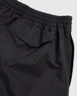 52% cotton. 48% nylon. Ultra-fine count cotton and nylon twisted tightly and densely beaten together. Smooth texture and fine luster. Elasticated drawstring waistband. Side hand pockets. Back flap pocket.