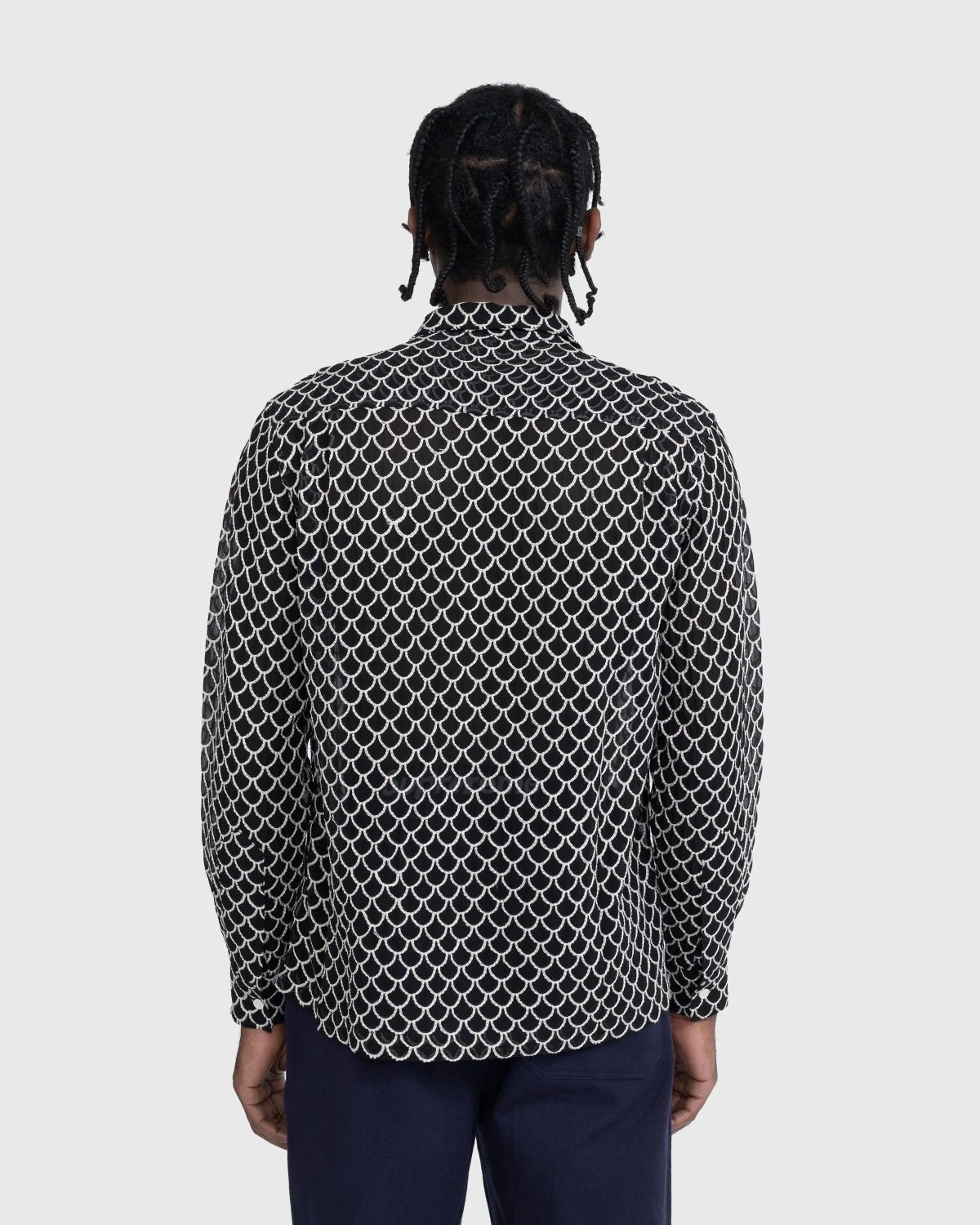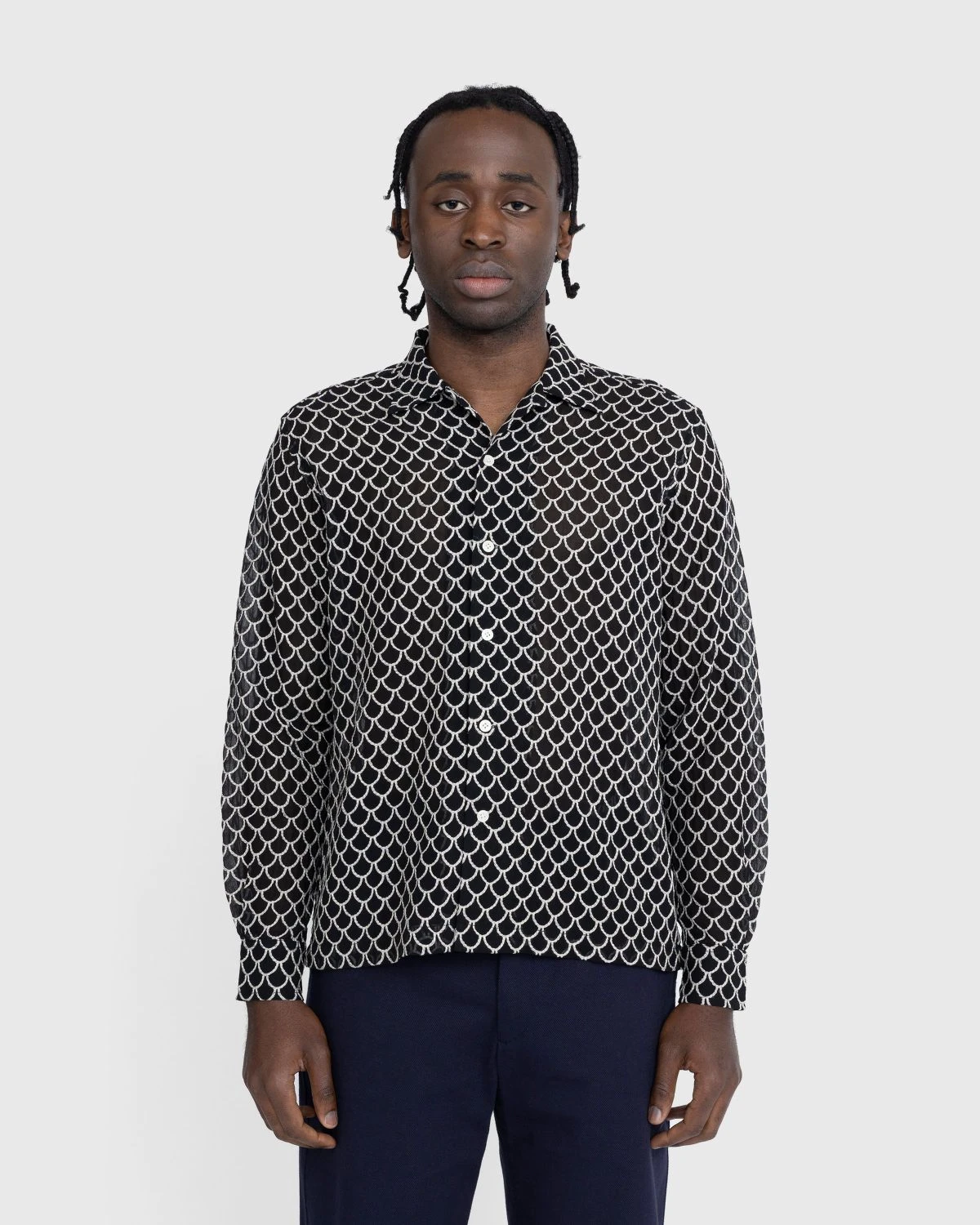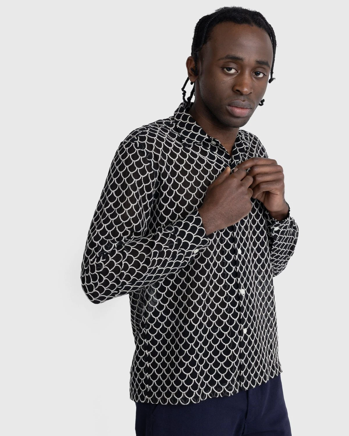 Bodeβs Sheer Siren Long-Sleeve draws inspiration from 1940s to 1960s deadstock Japanese embroidered fabric. An all-over pattern draws immediate attention to the boxy style, which is constructed from polyester, with details including a spread collar, button closure, button cuffs, and a straight hem.