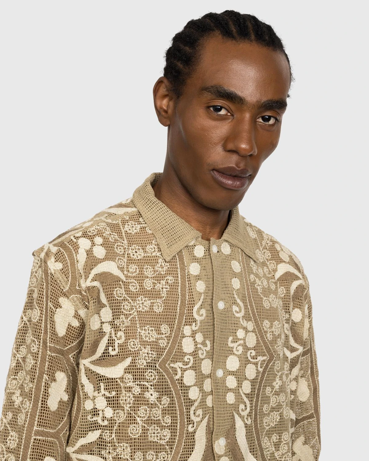 100% cotton. Brown netting in embroidery floss with a subtle sheen. Spread collar. Front button closure. Button cuffs.