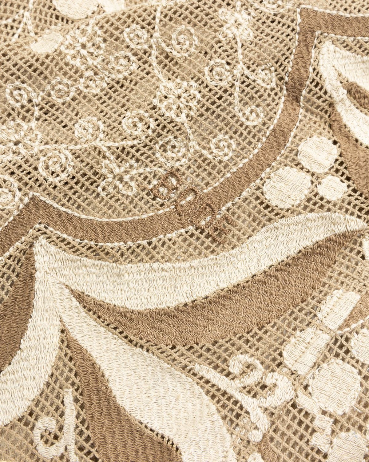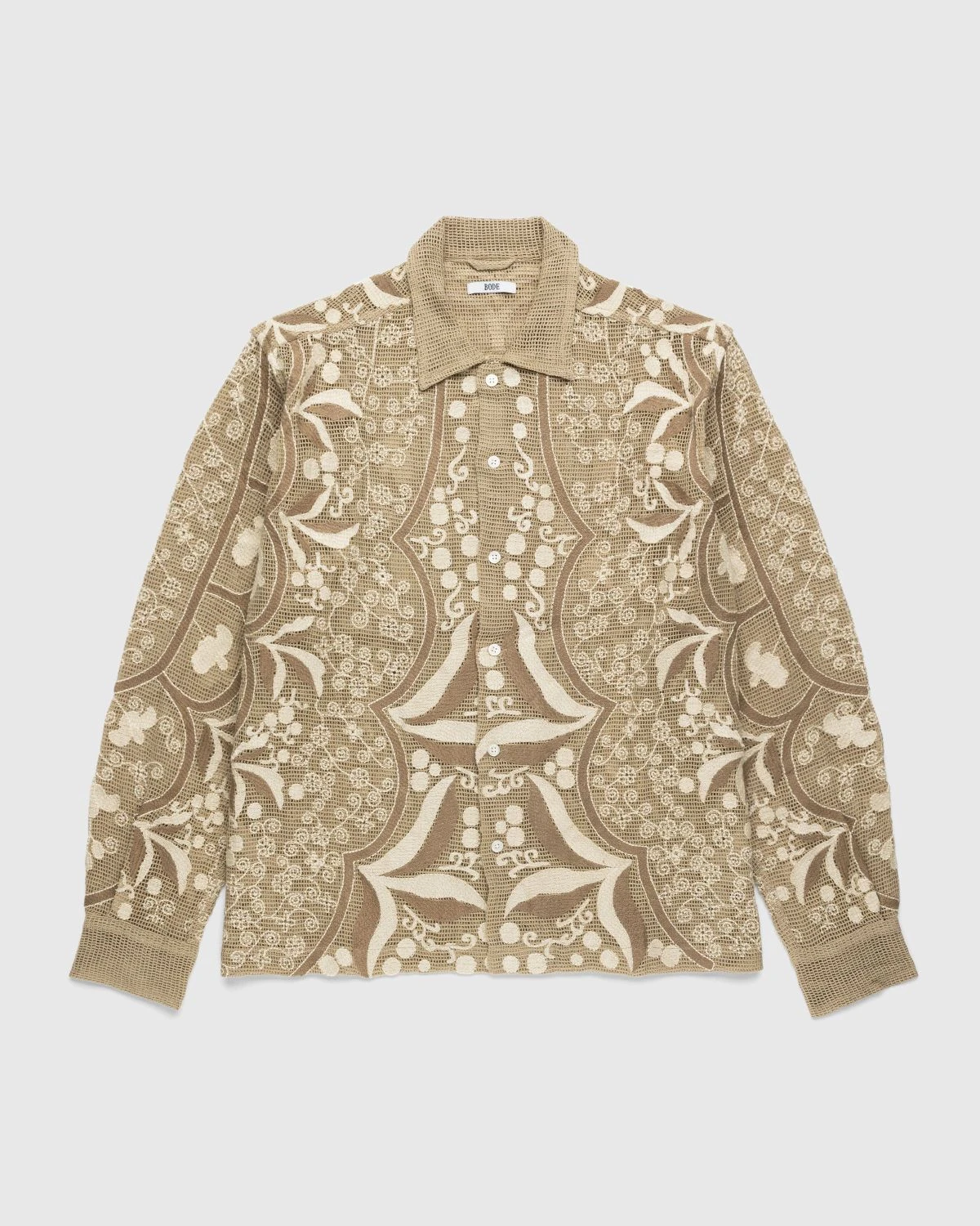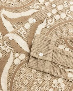 The Filigree Longsleeve is inspired by a filet lace tablecloth from the early 20th century. Filet refers to a type of lace that is embroidered over a fine mesh fabric. This intricate Bode garment sees the original pattern reproduced on brown netting in embroidery floss with a subtle sheen.