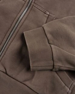 100% organic cotton. 510 gsm. Brushed back fleece. Enzyme wash. Full zip closure. YKK metal zip. Hood. Ribbed cuffs and hem. Two front pockets.