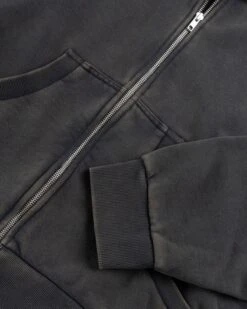 100% organic cotton. 510 gsm. Brushed back fleece. Enzyme wash. Full zip closure. YKK metal zip. Hood. Ribbed cuffs and hem. Two front pockets.