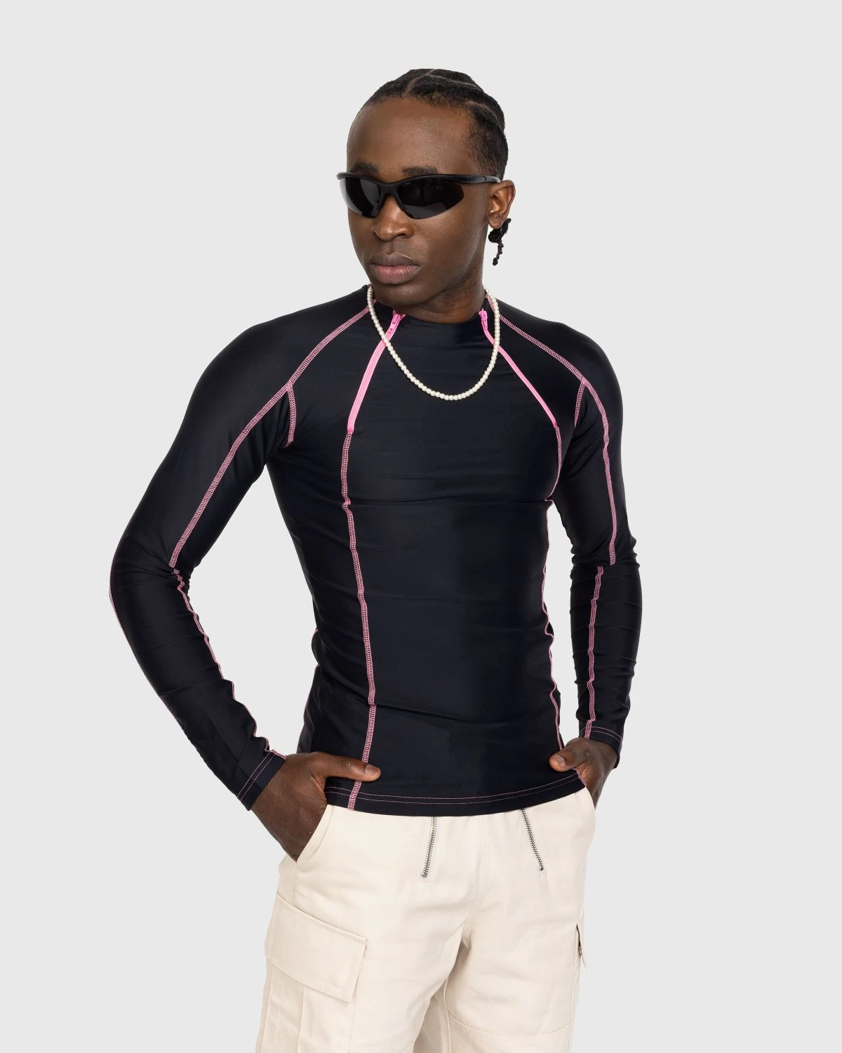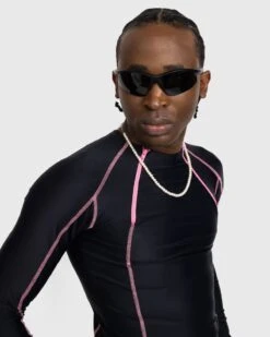 78% recycled nylon. 22% elastane. Overlock stitching. Mock neck collar. Twin zippered vents at the front. Contrasting hardware. Unisex.