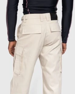 65% polyester. 35% cotton. Cotton poly twill. Belt loops. Adjustable waist tabs. Exposed double zips. Adjustable ankle hem. Cargo pockets at each leg. Side hand pockets. Back flap pockets. Unisex.