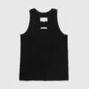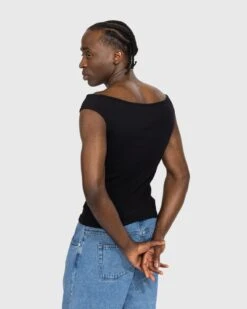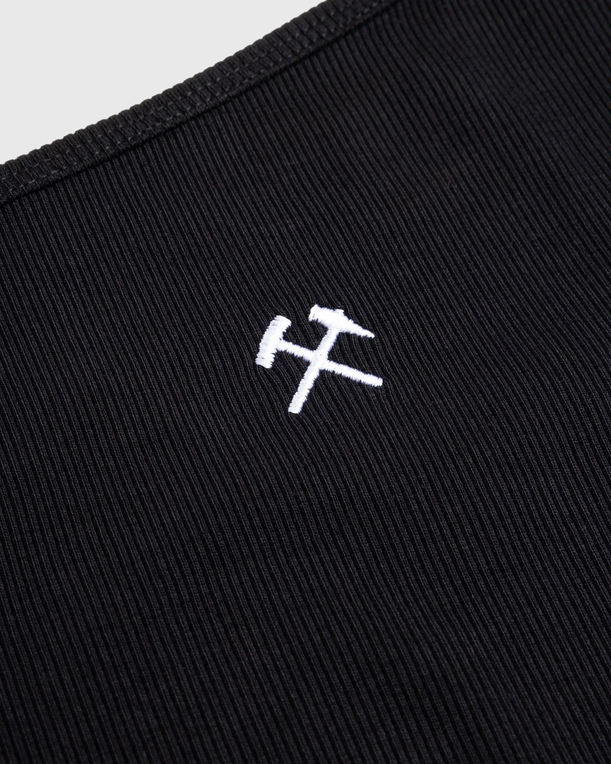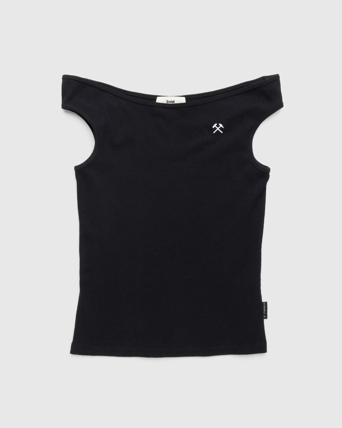 The Celil is a progressive unisex style produced in ribbed organic cotton. An elevated take on the off the shoulder tank top, the garment is cropped with a fitted cut and subtly branded with contrasting hammers embroidery at the chest.