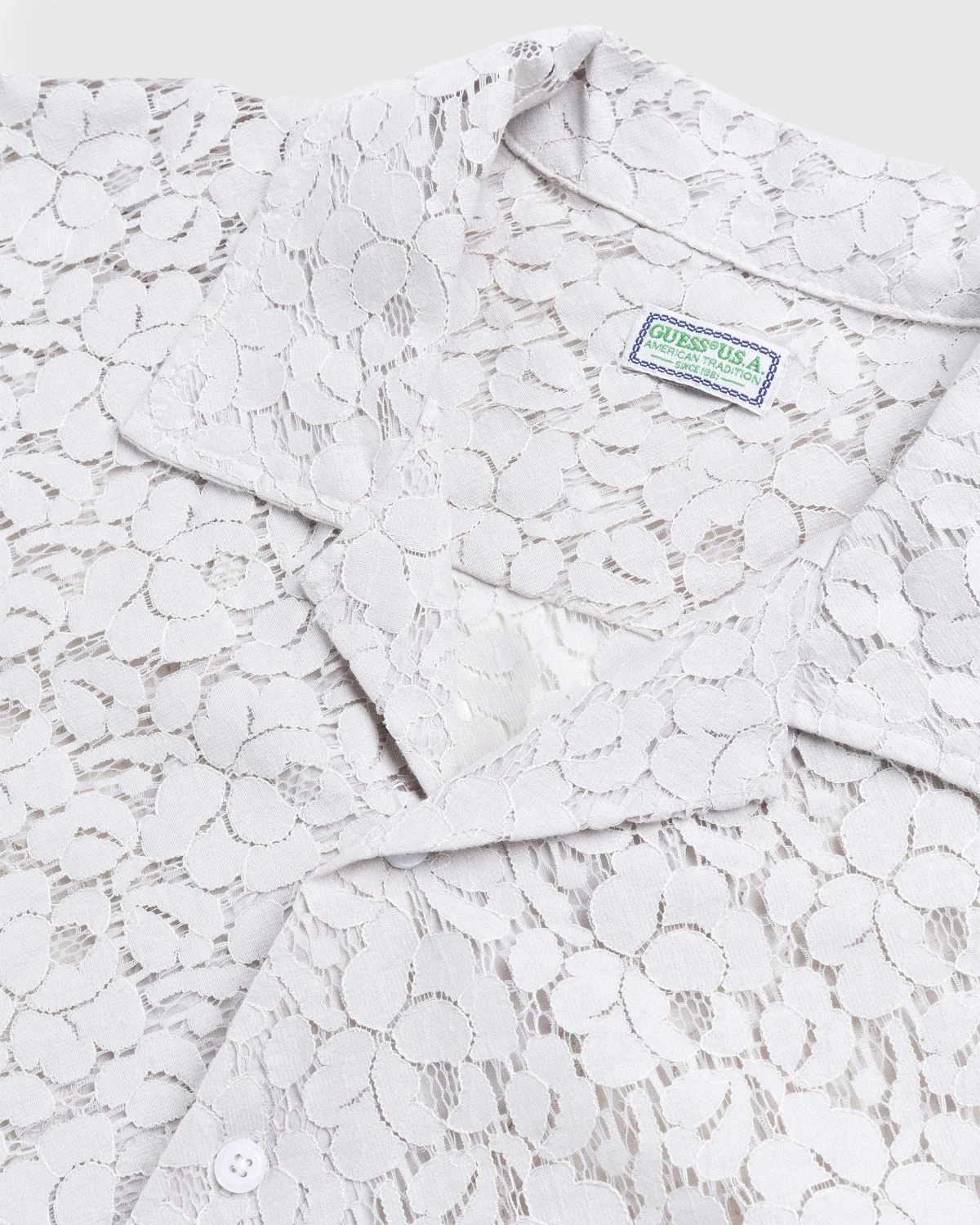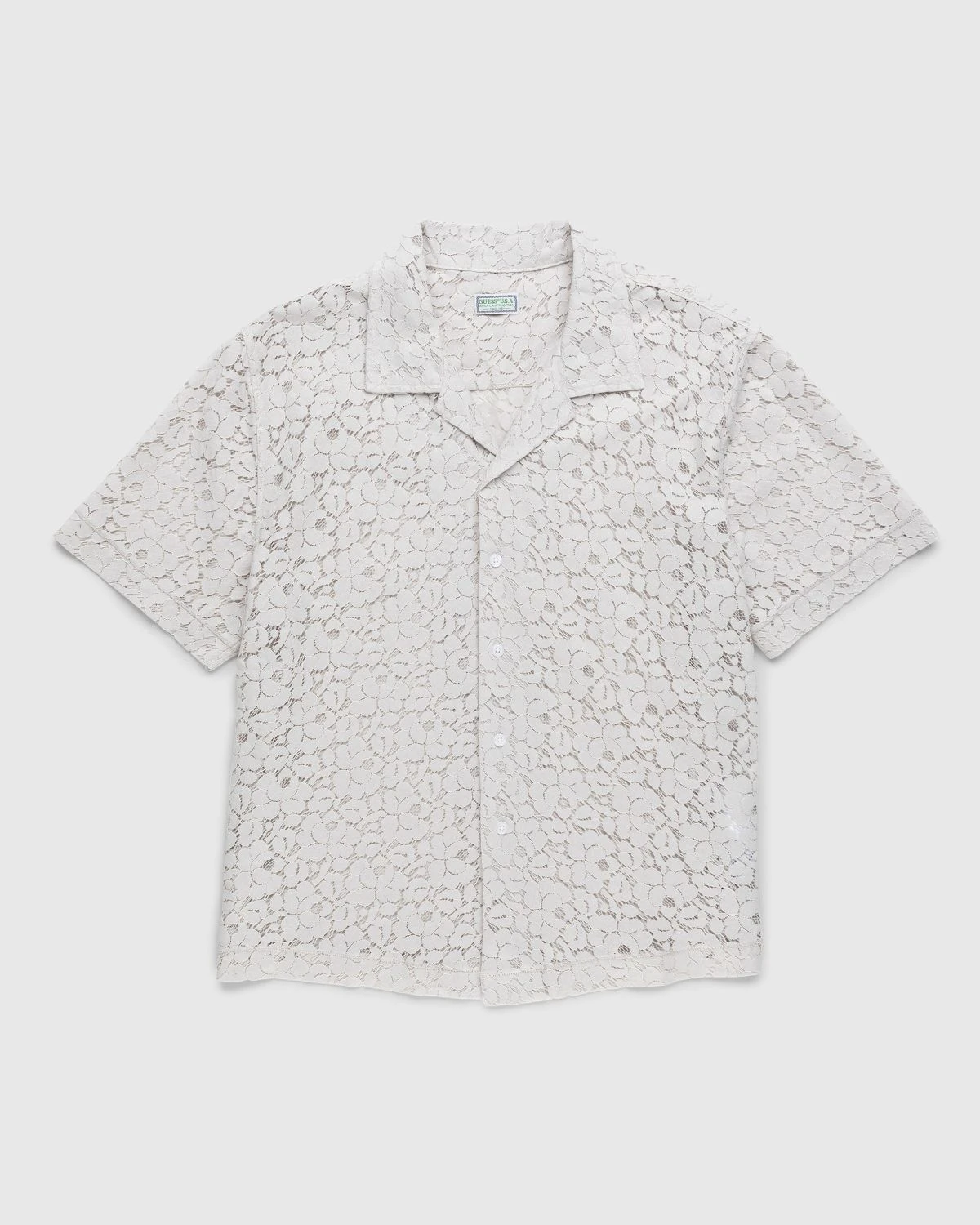 This seasonal Guess Camp Shirt showcases semi see-through lace construction from a cotton-polyester blend. Cut for a boxy, cropped fit, the garment features a traditional camp collar, button closure, and a straight hem, with a single chest pocket to complete the look.