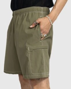 93% nylon, 7% polyurethane. Mesh lining. Elastic waist with an internal drawstring. Side cargo pocket.