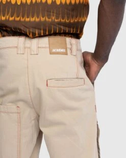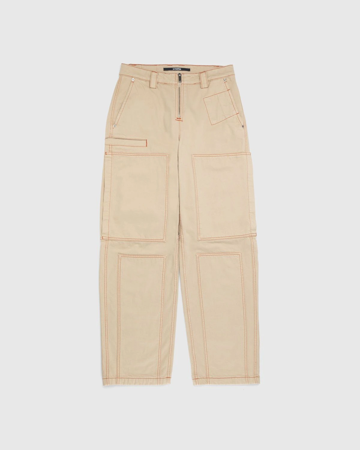 Le De Nimes Cargo is a contemporary, high-fashion update to the classic cargo pant. Produced in garment-dyed denim, the loose-fitting pair features metal rivets and contrasting workwear stitching. The exposed zip closure extends up to the top of the waist, while multiple workwear pockets are implemented throughout to define the silhouette. The style is finished with Jacquemus’ paper logo denim patch applied to the back of the waist.