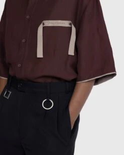 A short version of the traditional dress pant, Le Short Rond Carre is defined by round and square metal rings incorporated at the front belt loops. The pair is produced in wool suiting fabric, featuring hidden zip closure with corozo button fastening, side and back welt pockets, and front pleats.