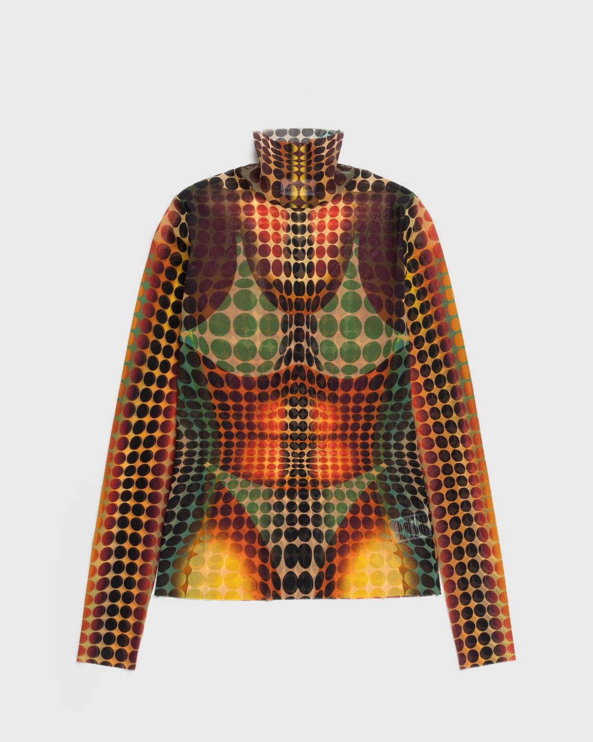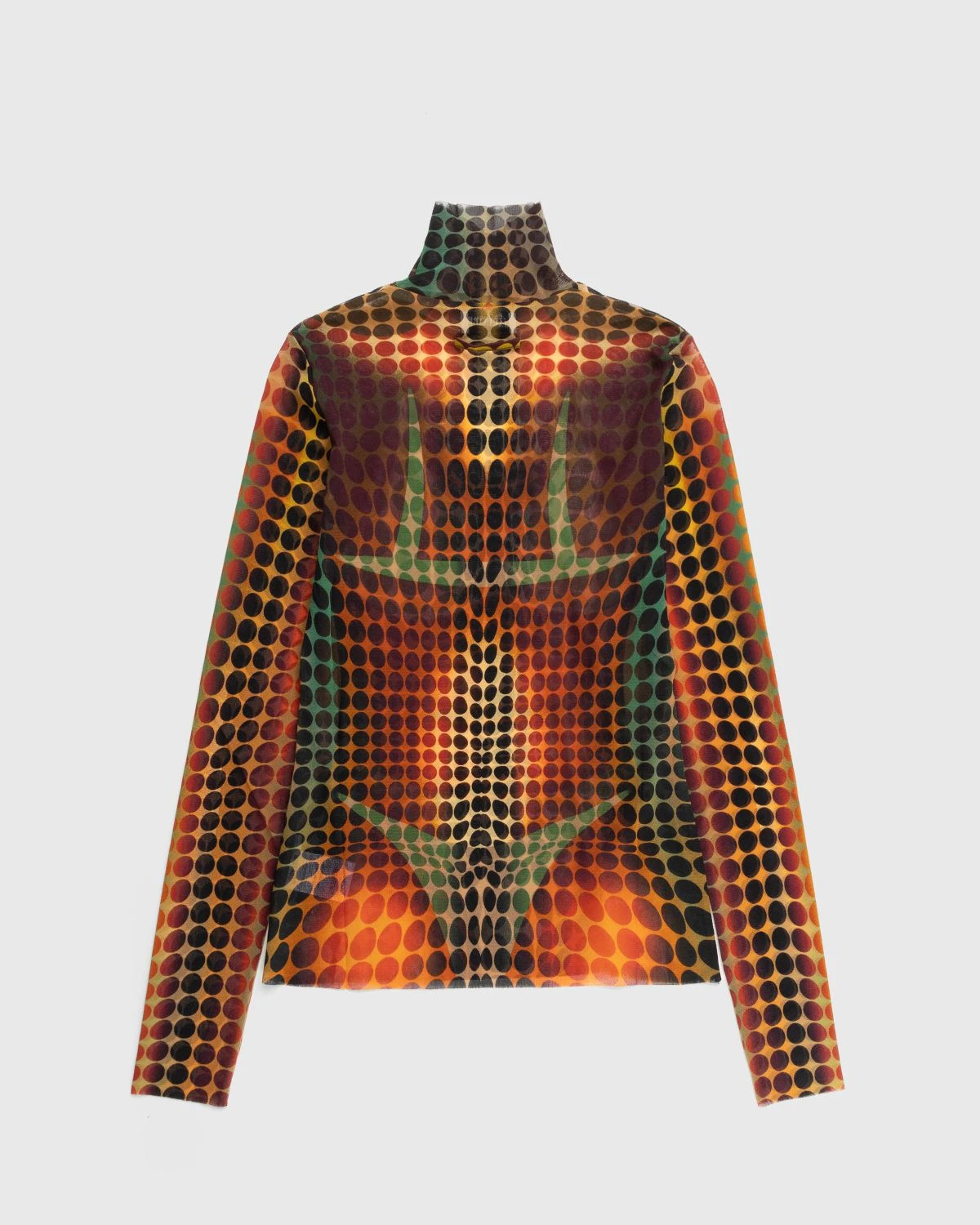 The dot print is a fixture in Jean Paul Gaultierβs retro-futuristic Cyber collection, which consists of polarizing ready-to-wear styles that point to the houseβs iconic β90s archives. The High Neck Longsleeve is one of many pieces to showcase the pattern, coming together in a multicolor look. A tulle style, the top is made from lightweight and stretchy nylon fabric and features a turtleneck.