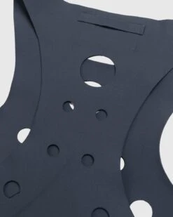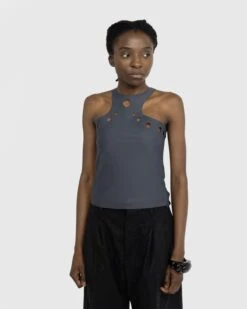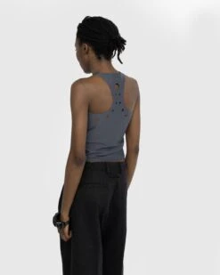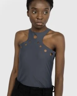 The Perforated Tank Top is included in Jean Paul Gaultierβs retro-futuristic Cyber collection, which consists of polarizing ready-to-wear styles that point to the houseβs iconic β90s archives. Crafted from a stretchy nylon and elastane blend designed to form to the body, the garment features a crew neck and is characterized by circular perforations that line the front and back of the silhouette.
