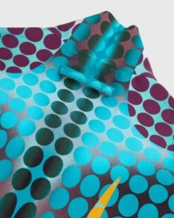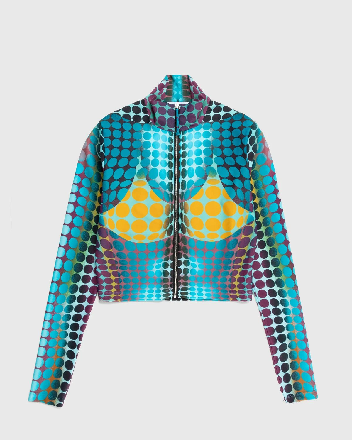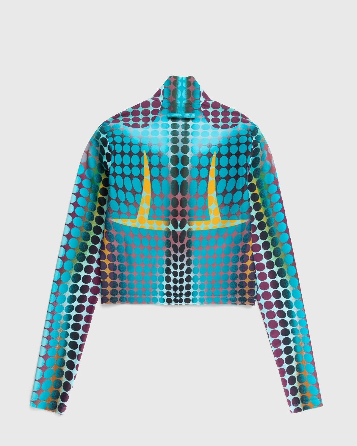 The dot print is a fixture in Jean Paul Gaultierβs retro-futuristic Cyber collection, which consists of polarizing ready-to-wear styles that point to the houseβs iconic β90s archives. The High Neck Zip Longsleeve is one of many pieces to showcase the pattern, coming together in a multicolor look. A cropped style, the top is made from lightweight and stretchy nylon and elastane blend fabric, featuring a turtleneck and metal zip fastening running down the center front.