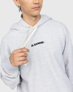 Primary fabric is 100% cotton. Secondary fabric is 94% cotton and 6% elastane. Pullover style. Adjustable drawstring hood. Ribbed cuffs and hem. Jil Sander+ logo at the chest.