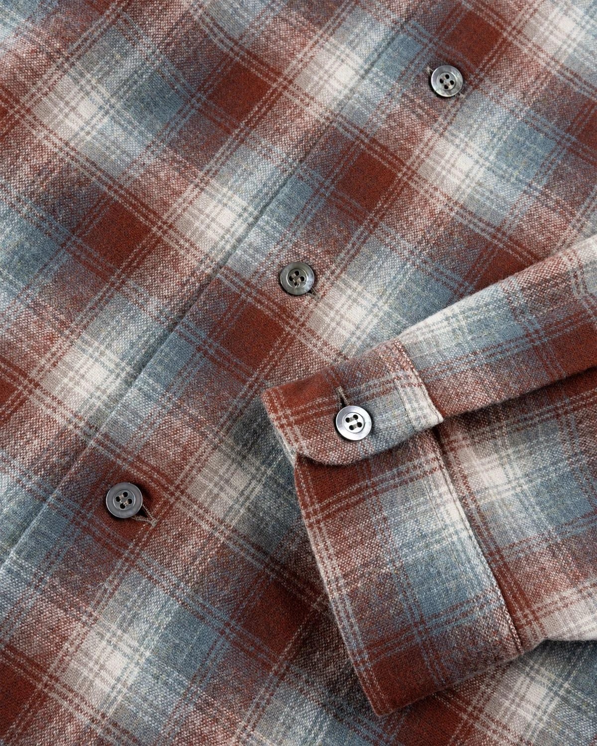 100% wool. Check pattern. Spread collar. Front button closure. Button cuffs. Mother of pearl buttons. Four stitches moniker at the back neck.