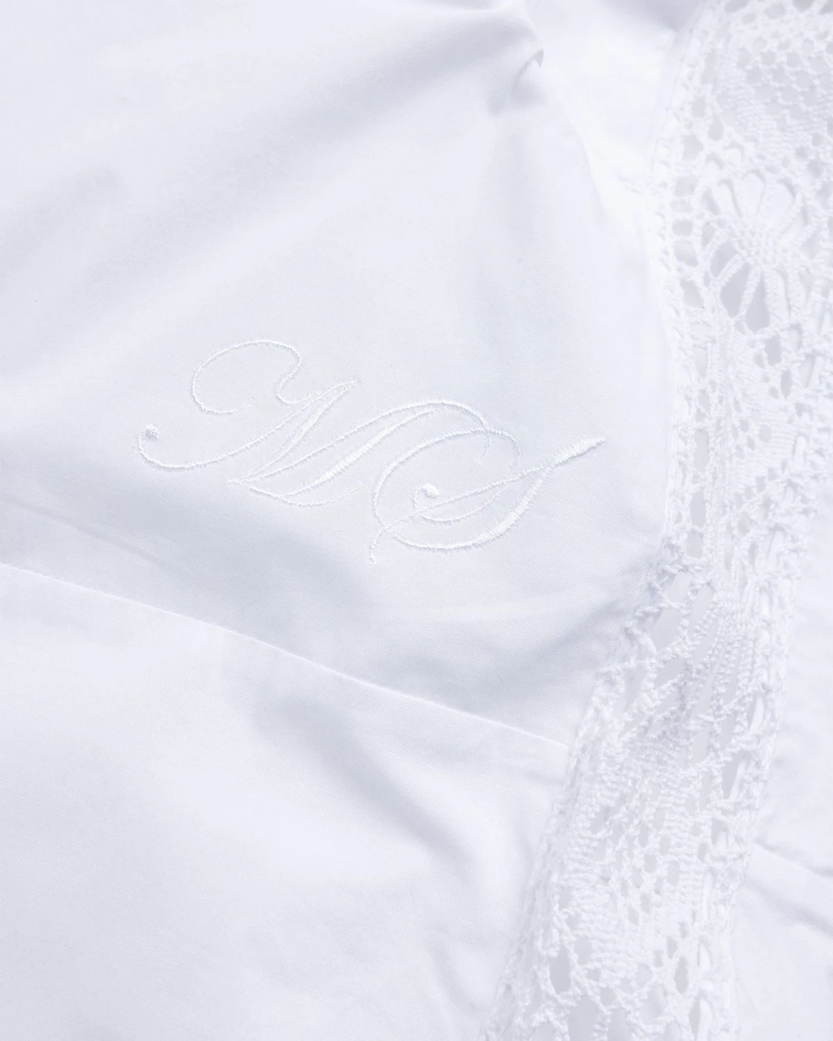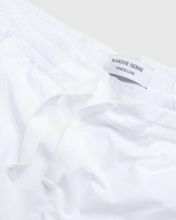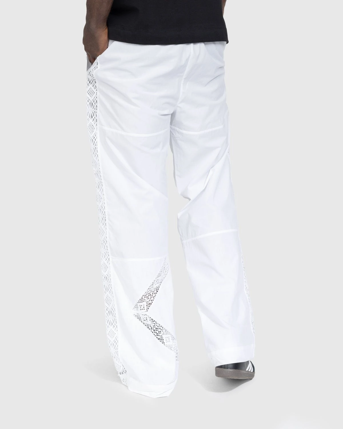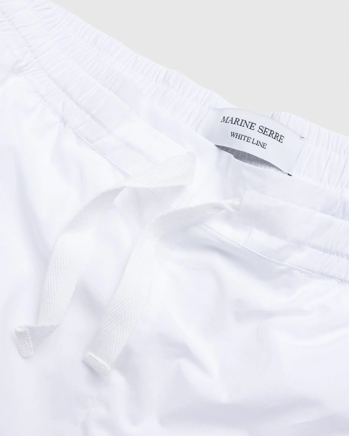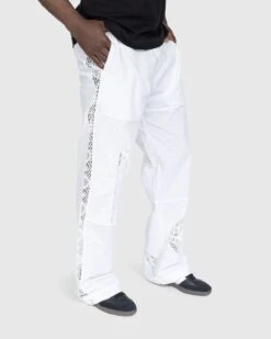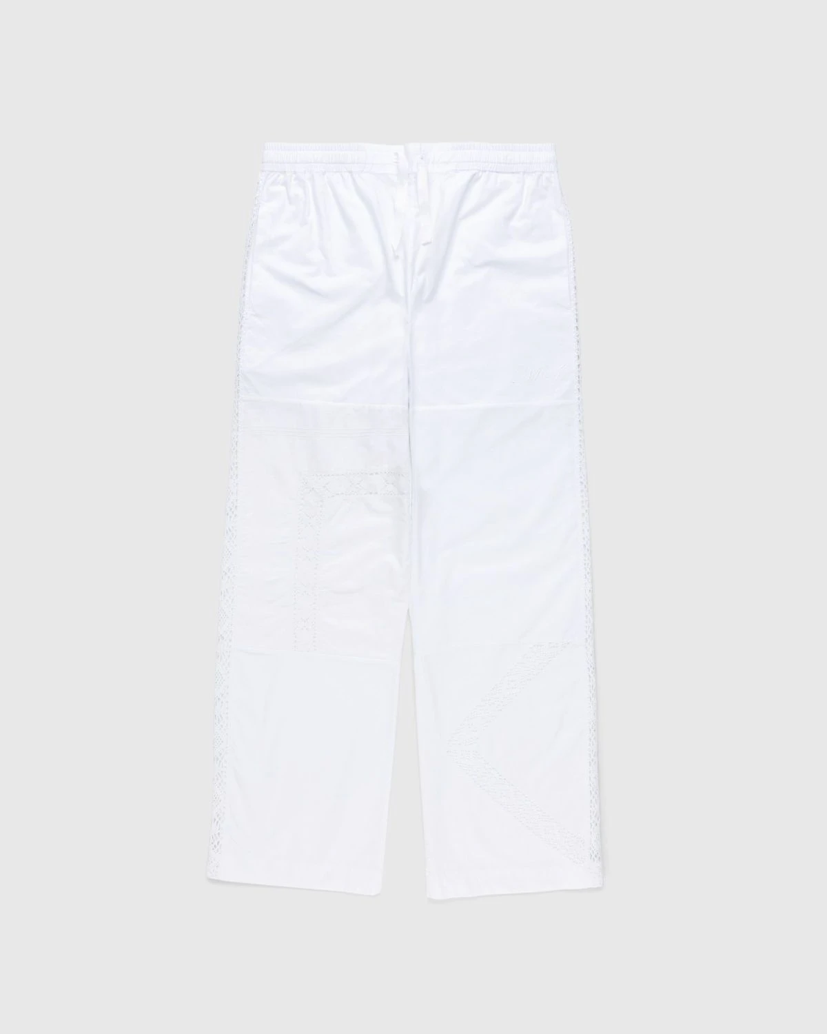 Regenerated from upcycled pillowcases, these Marine Serre bottoms are designed to blur the lines between loungewear and casualwear. The pair showcases a patchwork design made from cotton, with lace inserts that create a noticeable flare. Pockets are incorporated onto the sides of the silhouette, which is finished with subtle logo embroidery on the front.