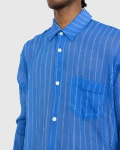 The Initial Shirt is a staple Our Legacy style cut from a variety of fine, delicate fabrics that are carefully sourced for specific characteristics. This particular version is made of a viscose-nylon blend and showcases an all-over stripe pattern. It features a generous, relaxed fit and is detailed with mother of pearl buttons, mitered cuffs, a curved hem, and wide box pleat.