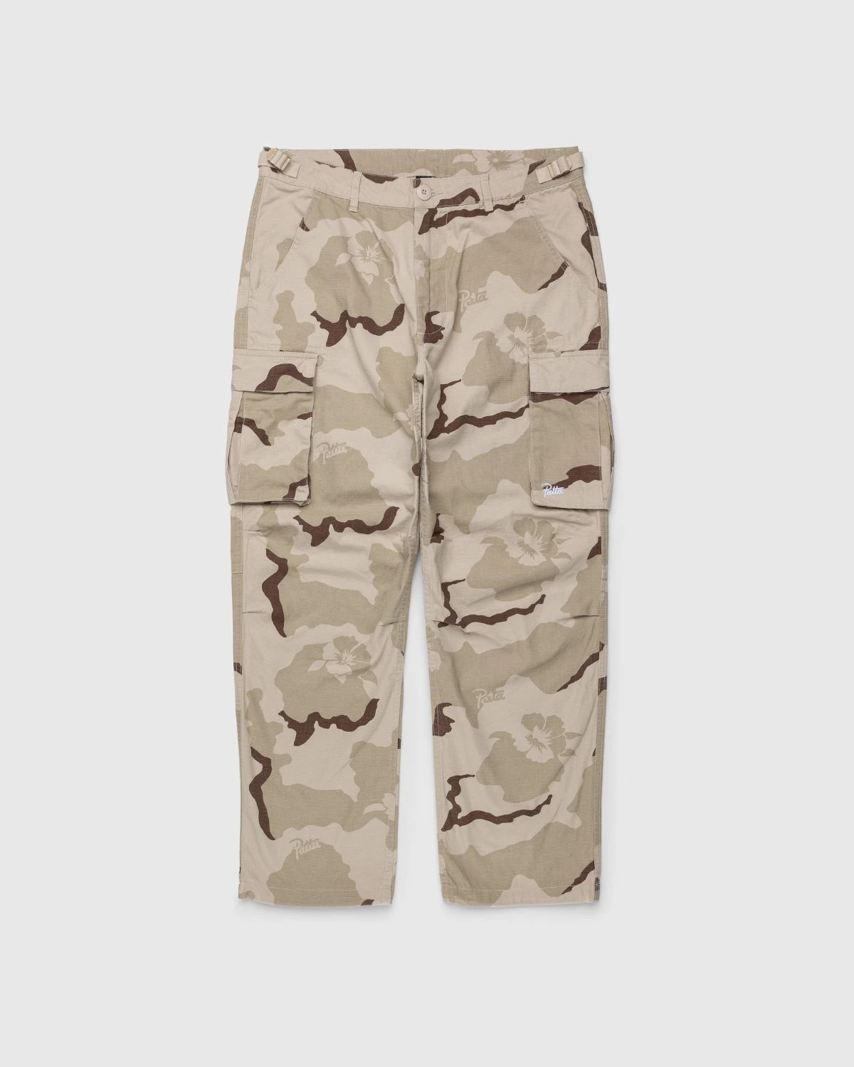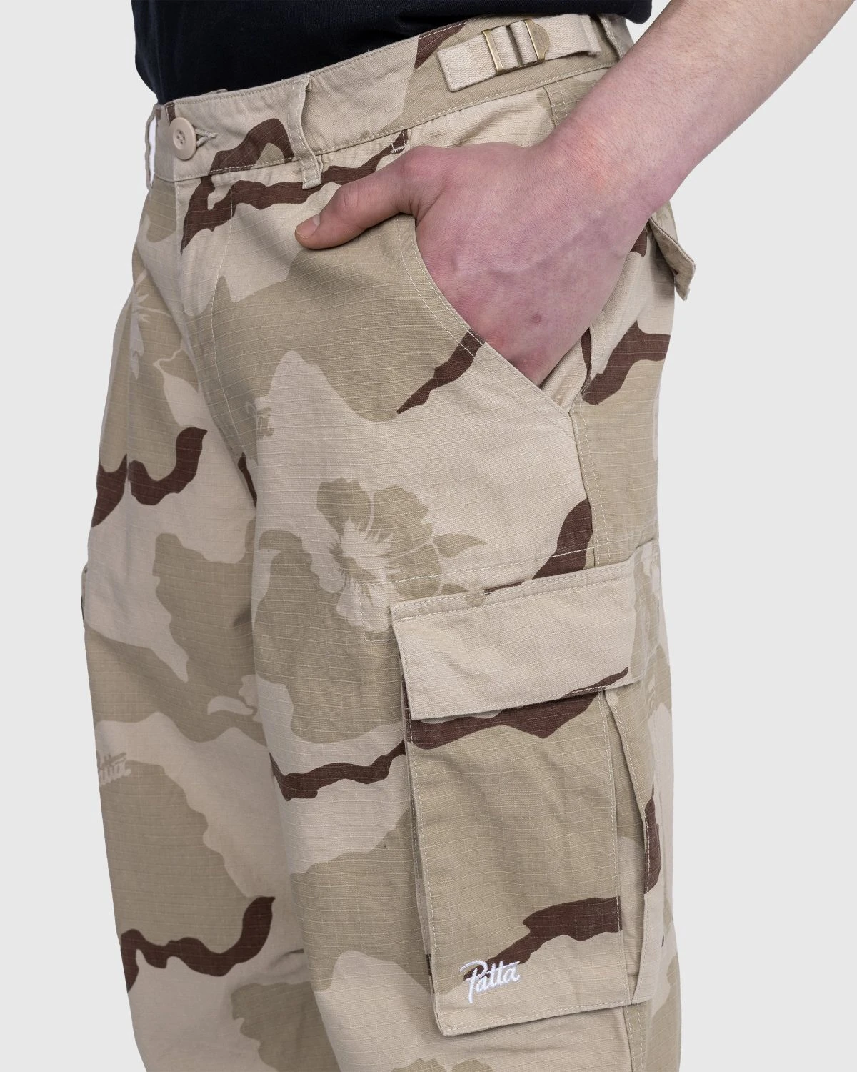 100% cotton. Enzyme-washed. All-over desert flower camouflage print. Button closure. Belt loops. Drawcords at the ankles. Side hand pockets. Two back flap pockets. Cargo pockets at each leg. Embroidered Patta script logo at the left cargo pocket.