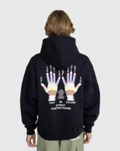 100% cotton. 400 gsm. Drawstring hood. Front pouch pocket. Ribbed cuffs and hem. Screenprinted Patta script logo at the left chest. Screenprinted Palmistry artwork at the back.