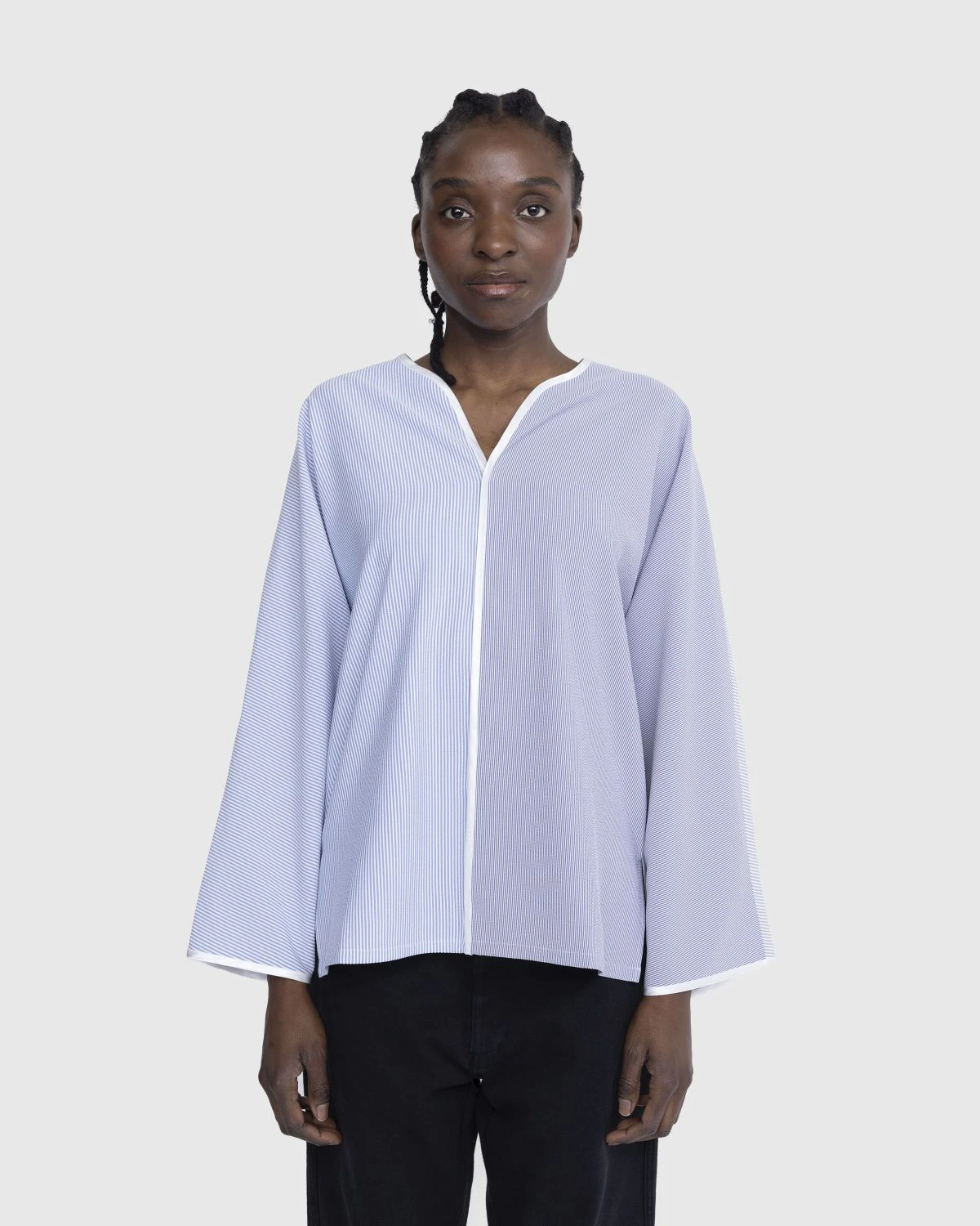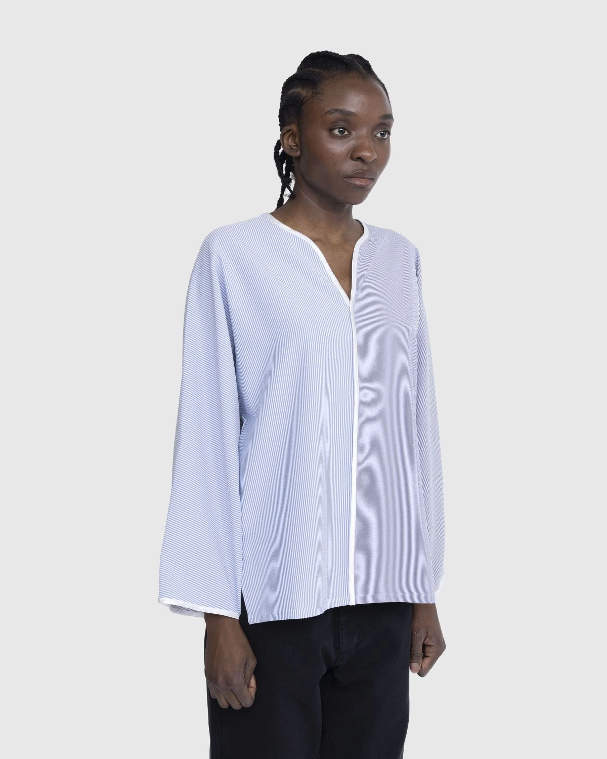 100% polyester. All-over striped pattern. V-neck. Long sleeves. Straight hem.
