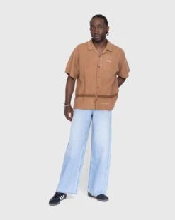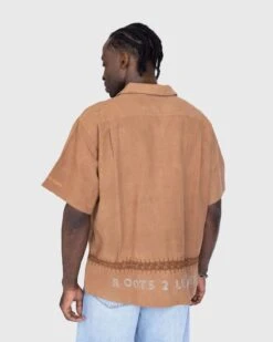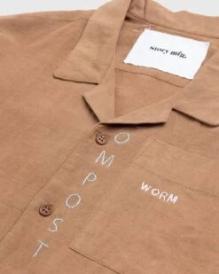 The Greetings Shirt is what Story mfg. likens to a big bowling shirt, with its oversized, cropped fit. This particular design is embellished with hand embroidery, which is showcased in multicolored lettering all throughout to give the top a distinctive look. Additional details include a spread collar, button closure, and a single chest pocket.