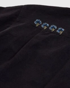 The Greetings Shirt is what Story mfg. likens to a big bowling shirt, with its oversized, cropped fit. This particular design is embellished with hand embroidery, which is showcased in multicolored artwork all throughout to give the top a distinctive look. Additional details include a spread collar, button closure, and a single chest pocket.