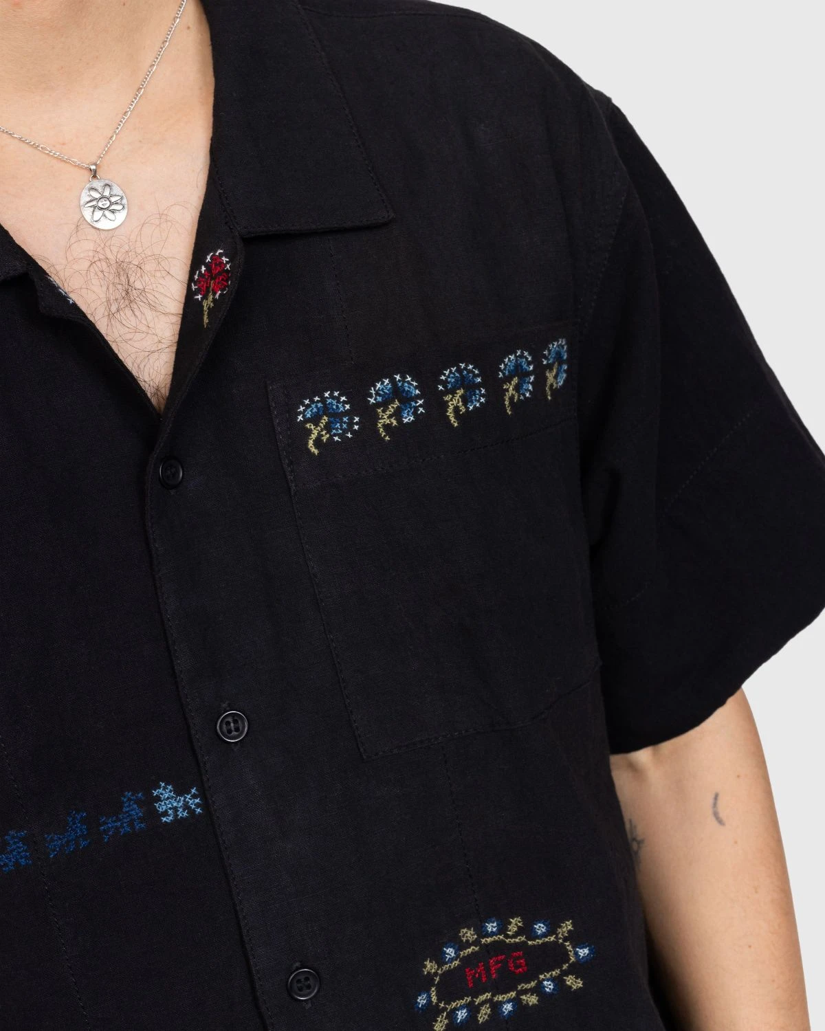 Cross stitch hand-embroidered from 100% cotton linen. Spread collar. Button closure. Left chest pocket. Embroidered detail.
