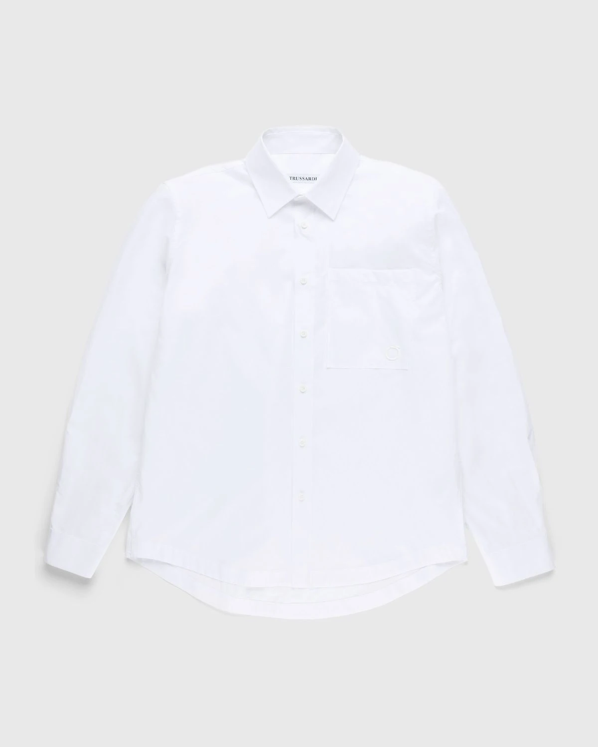 A crisp white button-down is an essential in any wardrobe. Trussardiβs take on the timeless staple is produced in cotton poplin, featuring a classic Kent collar and button fastenings. Additional details include button cuffs and a curved hem, as the style is subtly branded with a tonal circular Levriero logo at the left chest pocket.