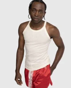 Wales Bonner updates archival leisurewear with the Groove Tank, offered here in the brandβs signature ivory shade. The slim-fitting style is predominantly made from organic cotton and subtly embellished with a small logo implemented at the chest.