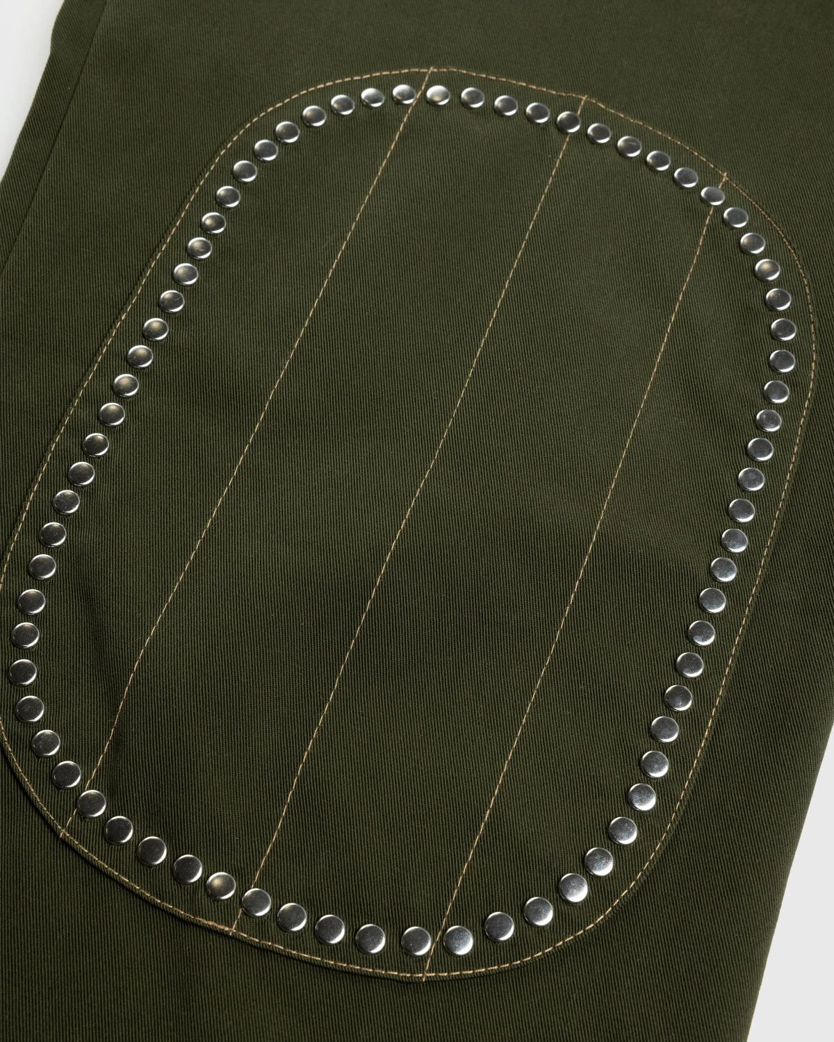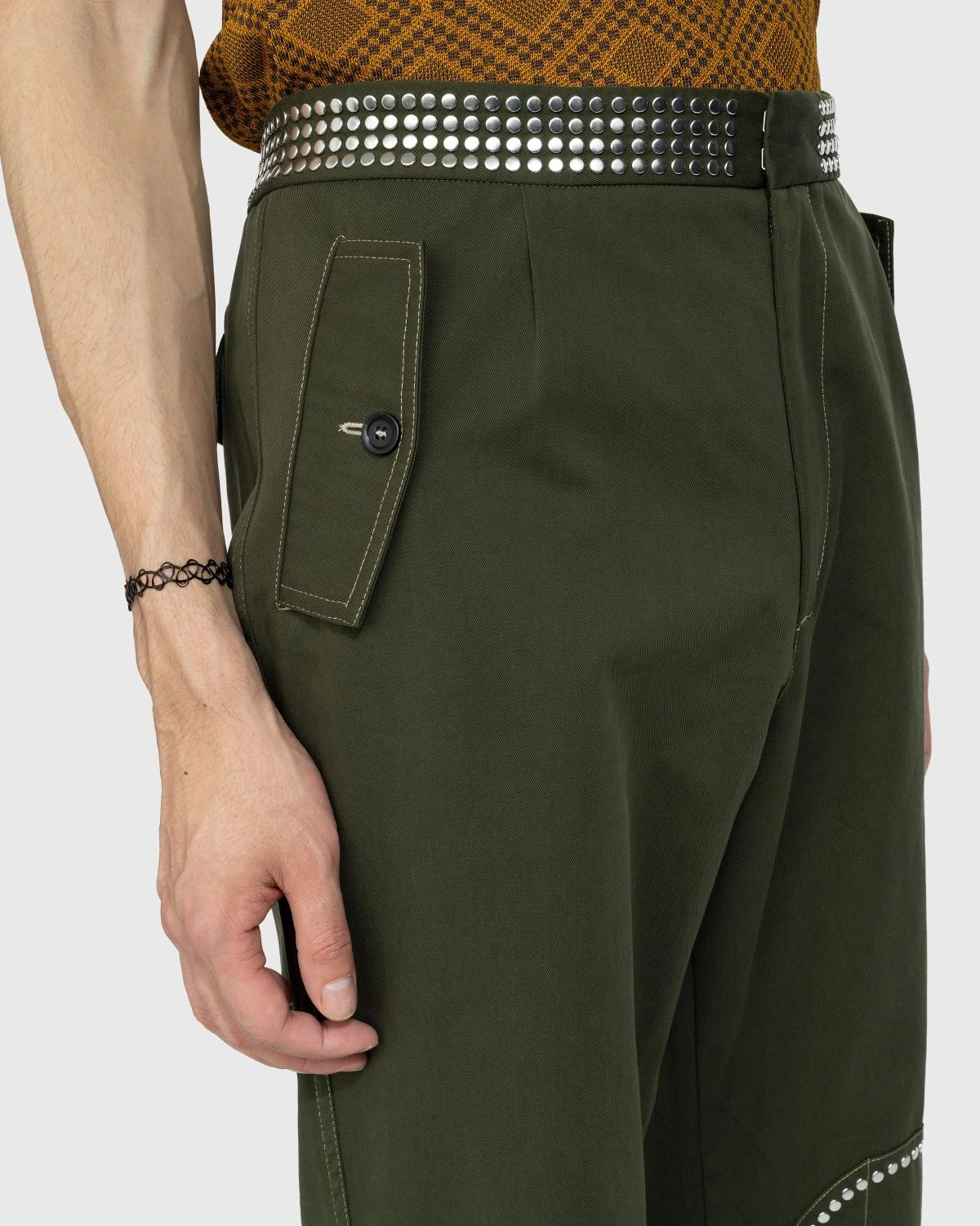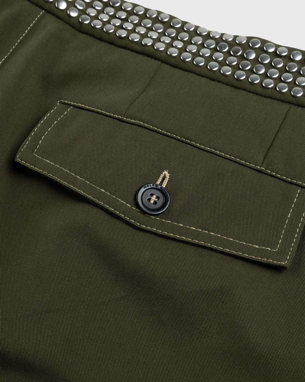 Wales Bonnerβs Tomorrow Trousers draw immediate attention with studded ornamentation applied to the waistband and around the knee patches. The pair is cut for a straight fit and slightly cropped in length, made from 100% cotton drill. Pockets are incorporated at the sides and back by way of buttoned flap pockets for added security.