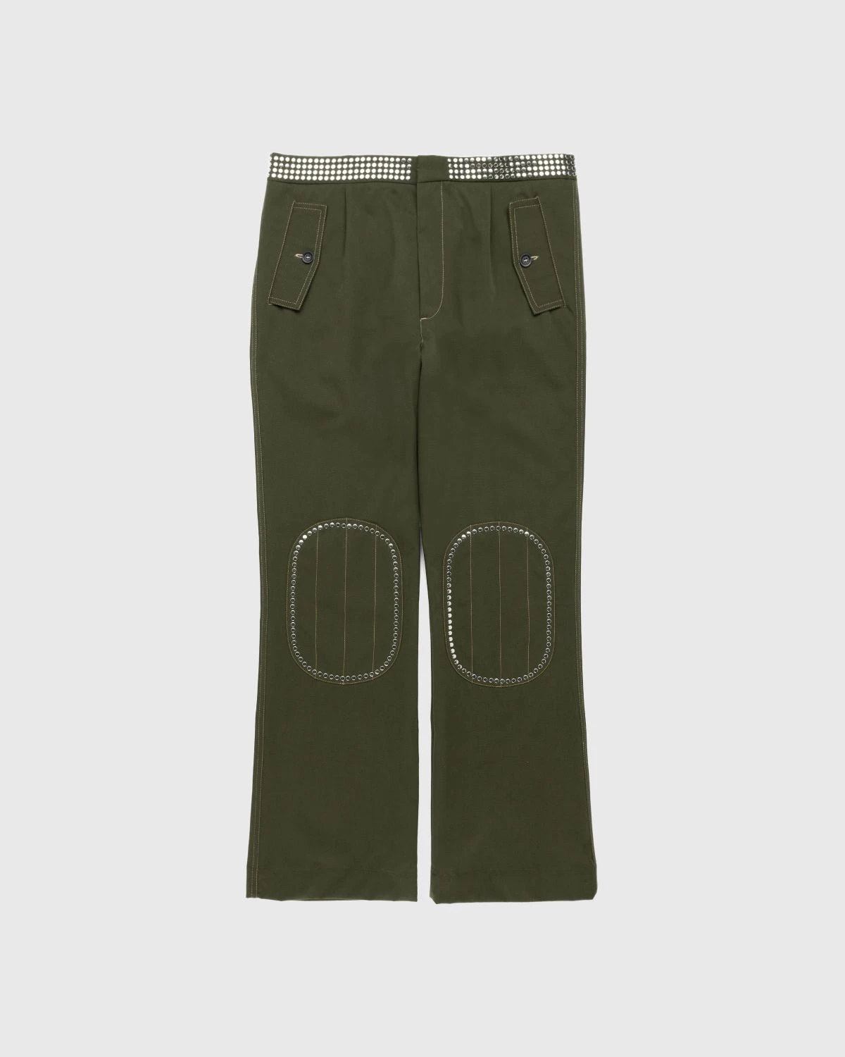 100% cotton drill. Studded details at the waistband and around the knee patches. Concealed fastening. Flap hand and back pockets.