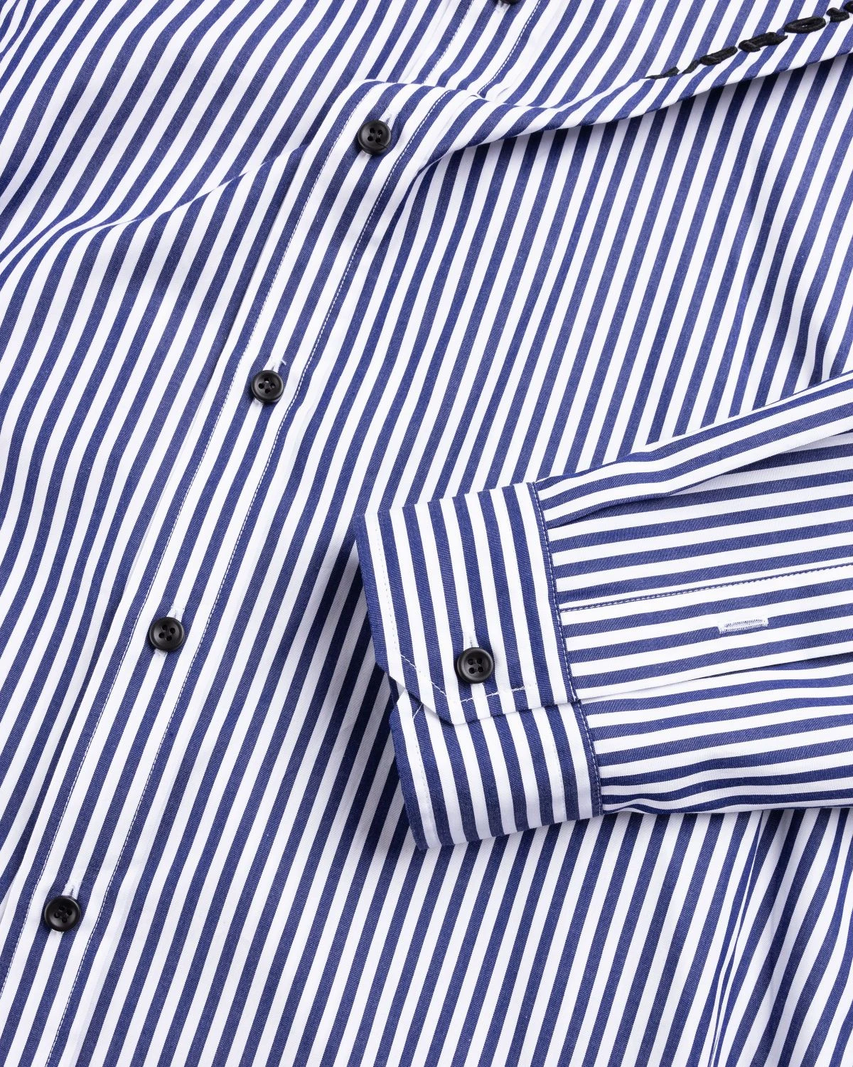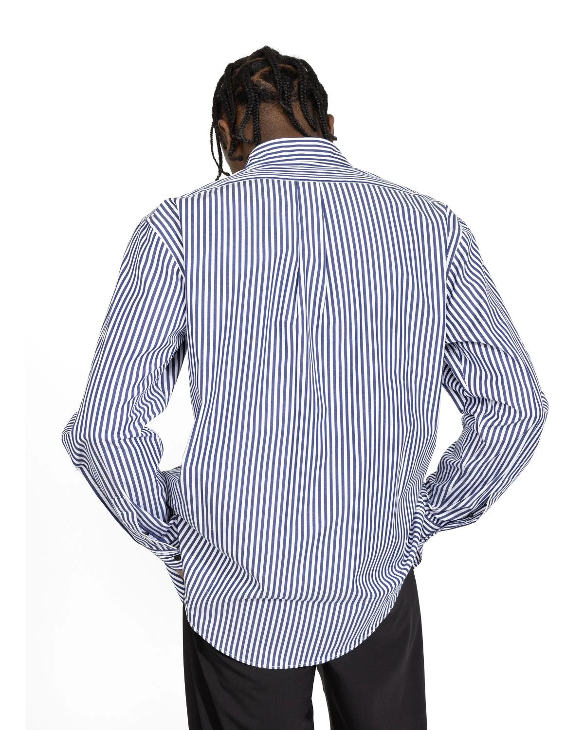100% cotton. Vertical stripe pattern. Button closure. Pointed collar. Button cuffs. Pinched embroidered logo at the upper left torso.