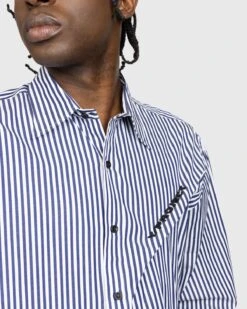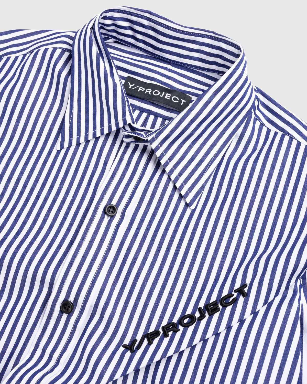 This longsleeve button-down by Y/Project showcases the labelβs polarizing pinched design by way of an embroidered logo implemented at the upper left torso. The garment then showcases an all-over, vertical striped pattern, while featuring a classic collar and traditional front button closure, with matching button cuffs.